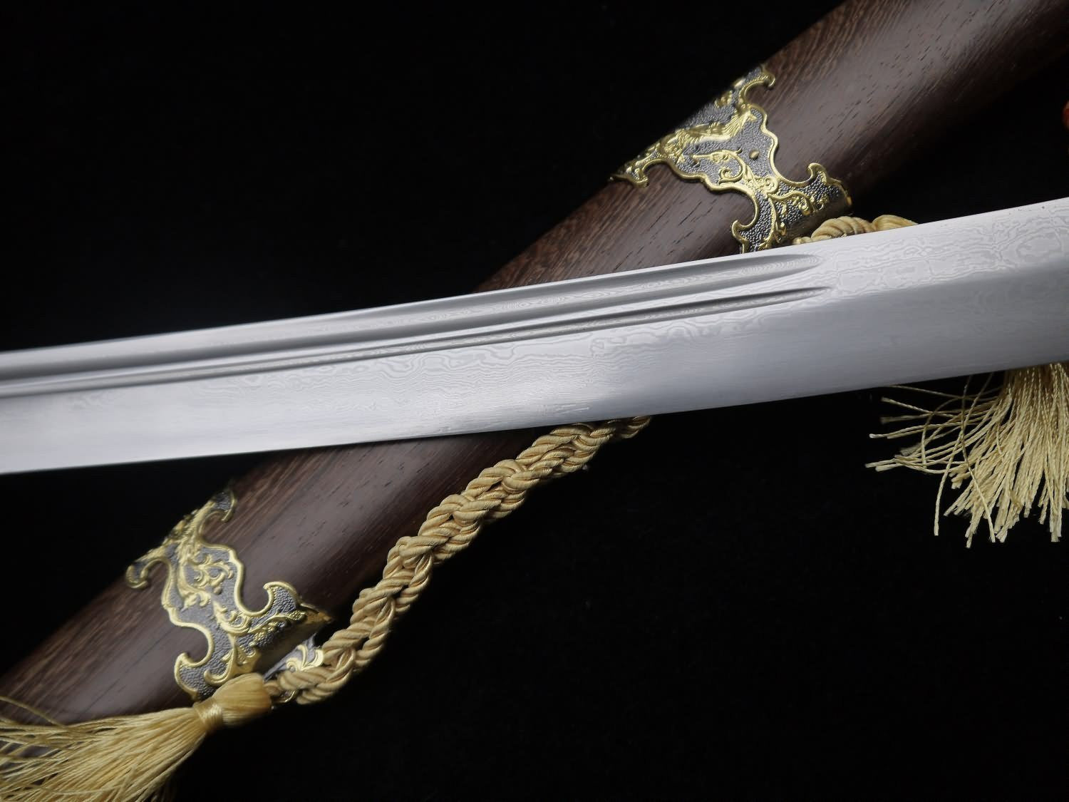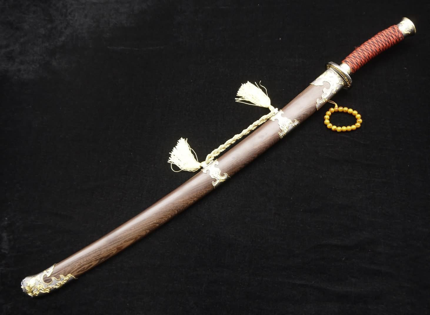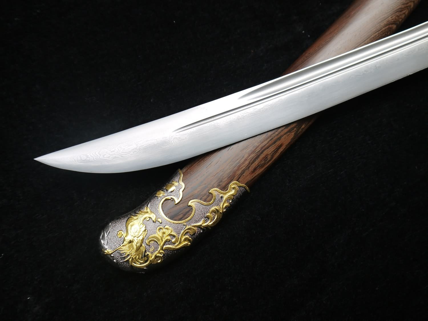 Sword generally consists of three components:blade,sheath and accessories.The main body, blade,is mostly iron,steel,copper.Sheath is made by wood. In order to avoid getting rusted,it should not be stored in damp place nor contact with sour, salty substances. Hand touch should also be avoided in case the surface got corroded by sweat.Oil shoul be applied on surface for maintainance for medium carbon steel,high carbon steel,pattern-welded steel(Damascus steel)material stainless steel blade.
