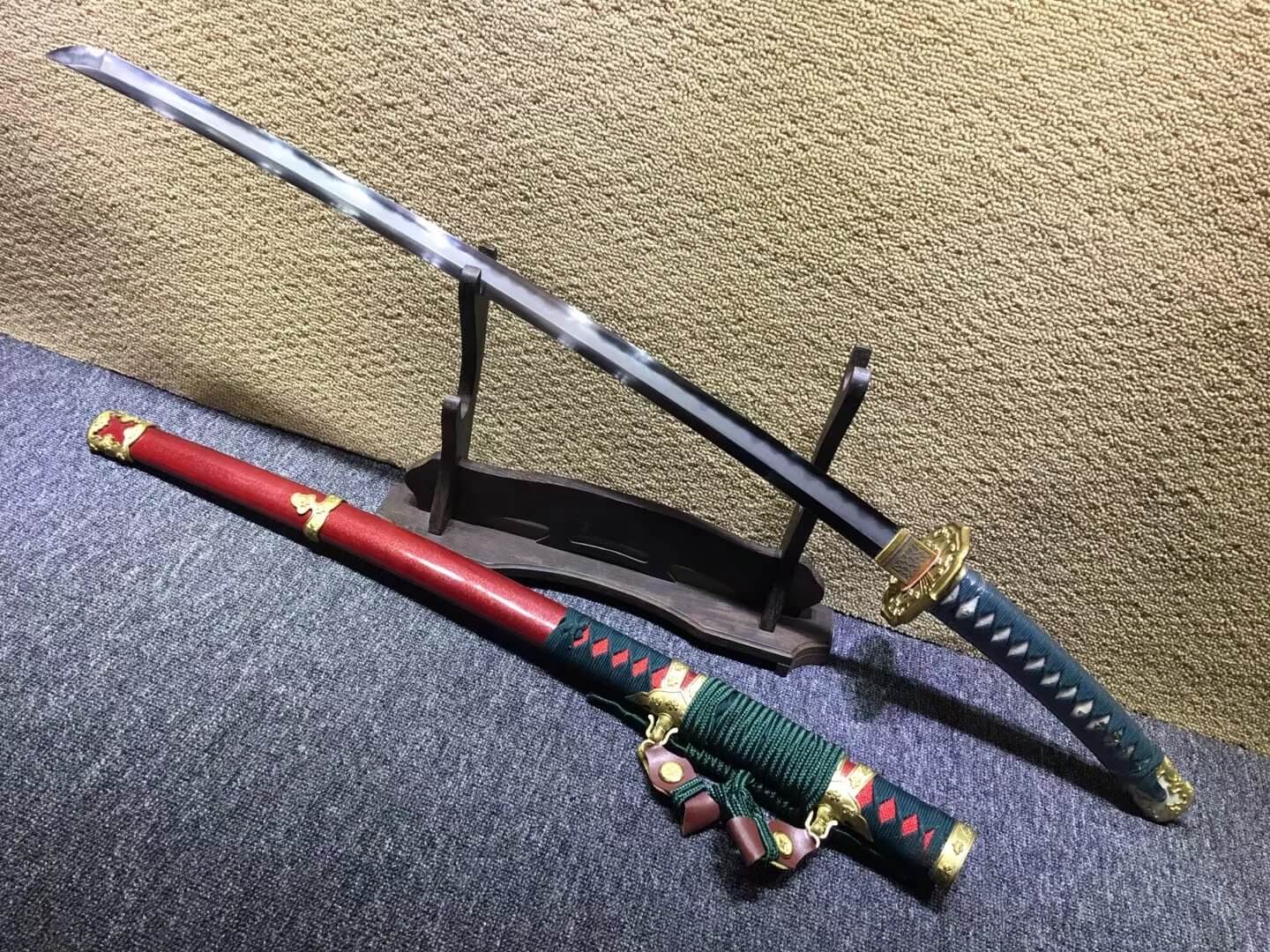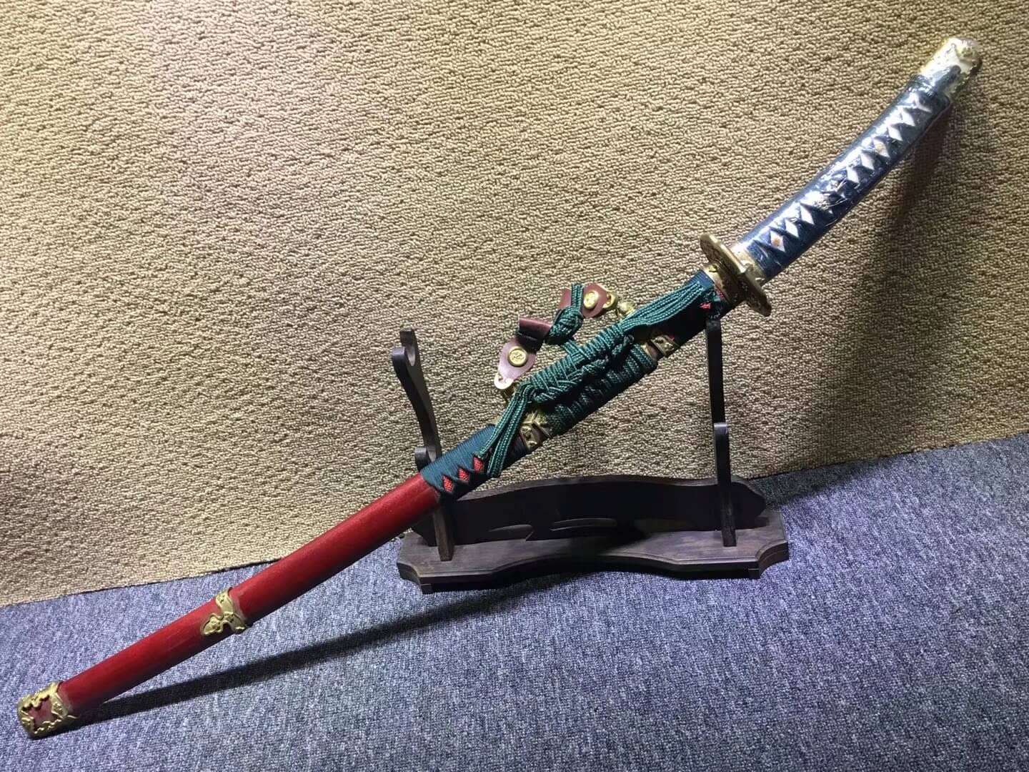 Sword generally consists of three components:blade,sheath and accessories.The main body, blade,is mostly iron,steel,copper.Sheath is made by wood. In order to avoid getting rusted,it should not be stored in damp place nor contact with sour, salty substances. Hand touch should also be avoided in case the surface got corroded by sweat.Oil shoul be applied on surface for maintainance for medium carbon steel,high carbon steel,pattern-welded steel(Damascus steel)material stainless steel blade.