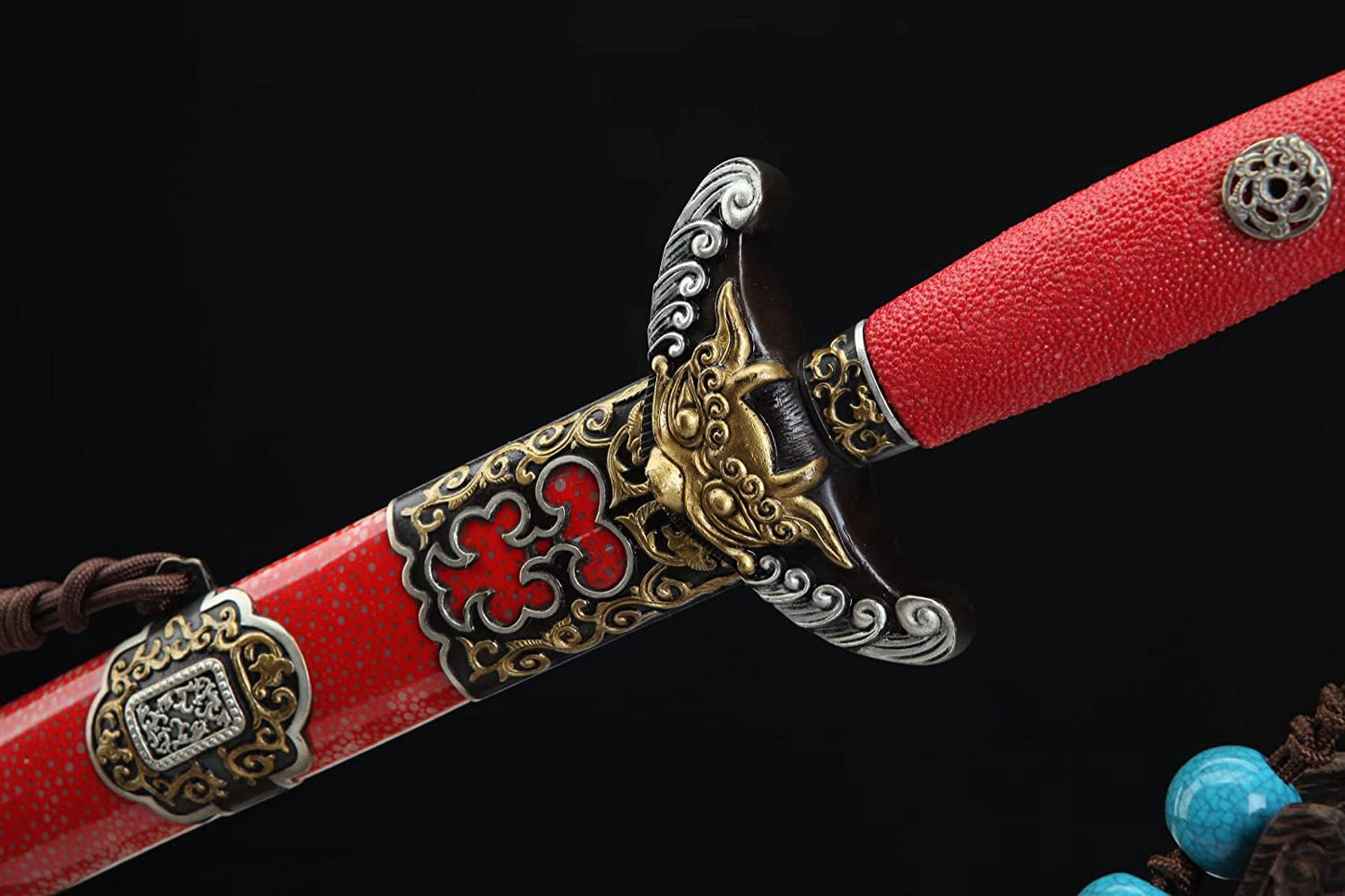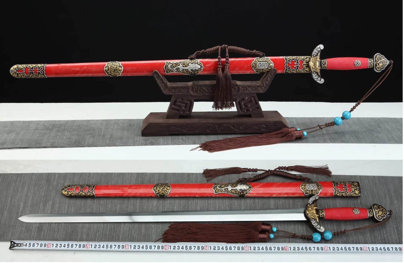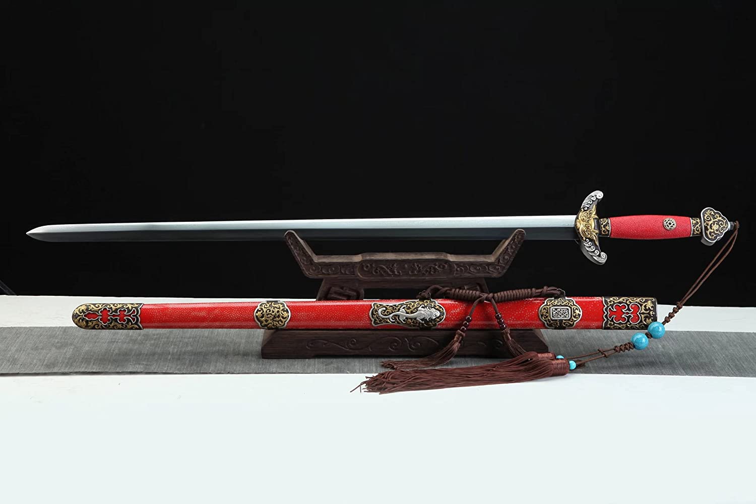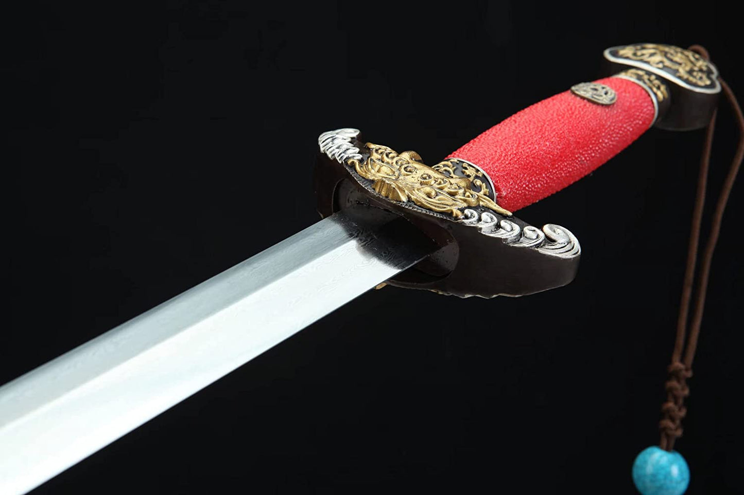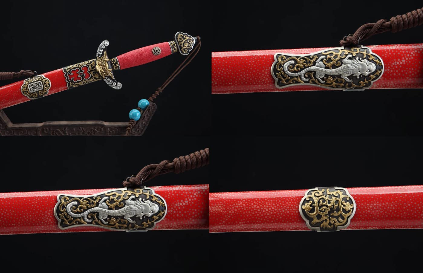 Qianlong Swords,Damascus Steel Blades,Red Skin Scabbard,Brass Fittings