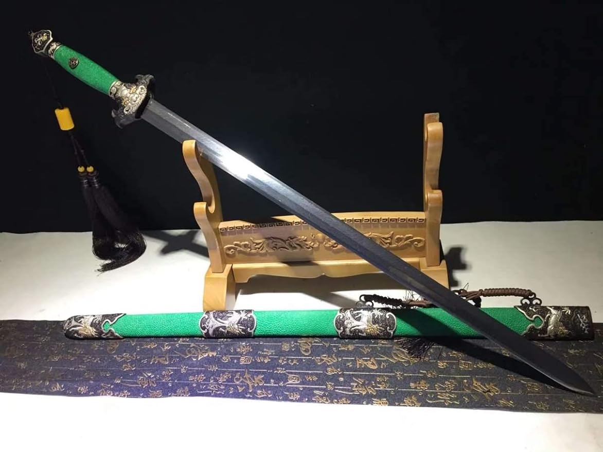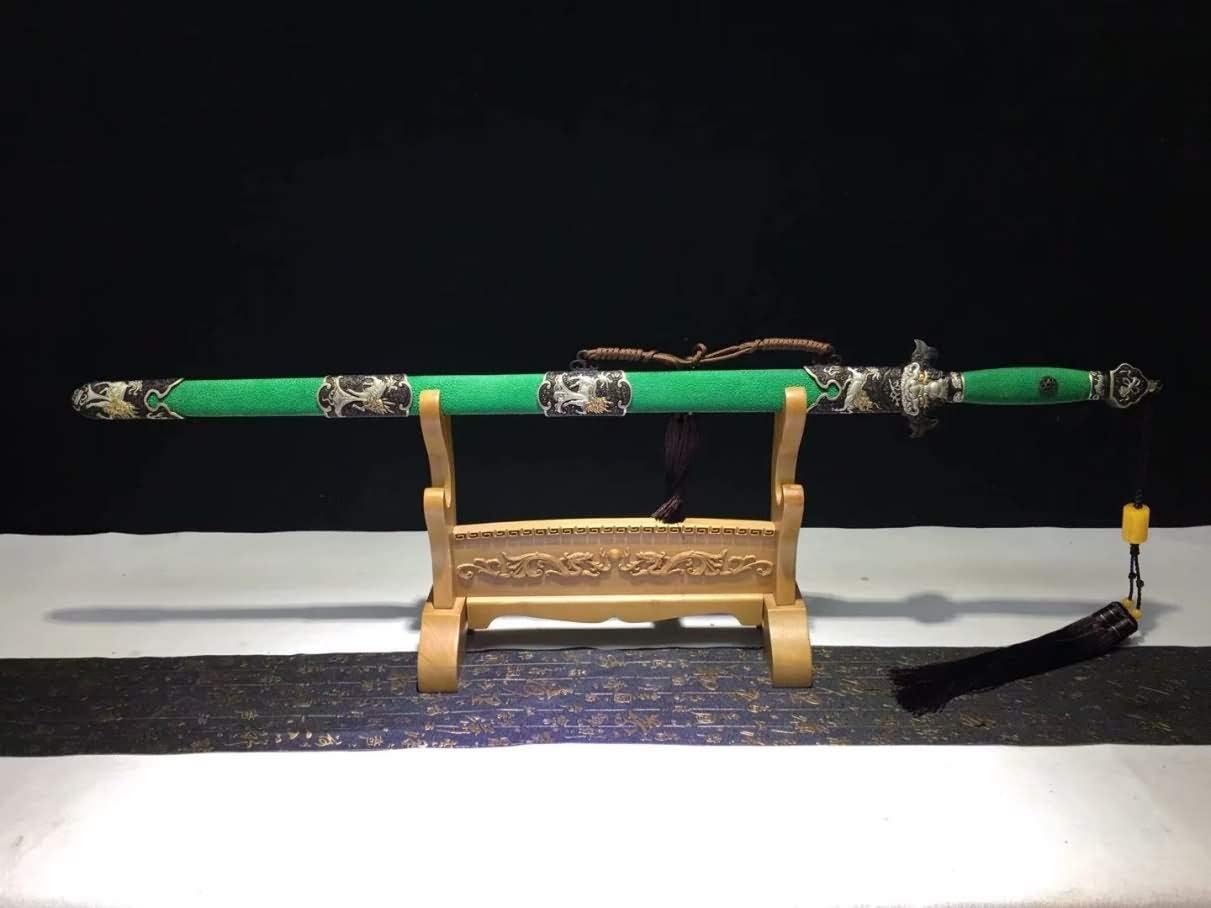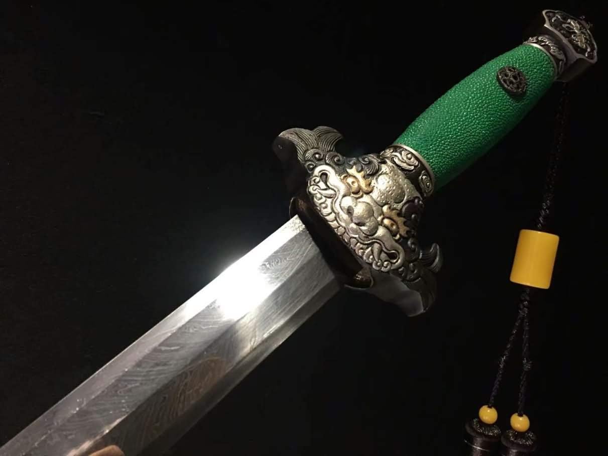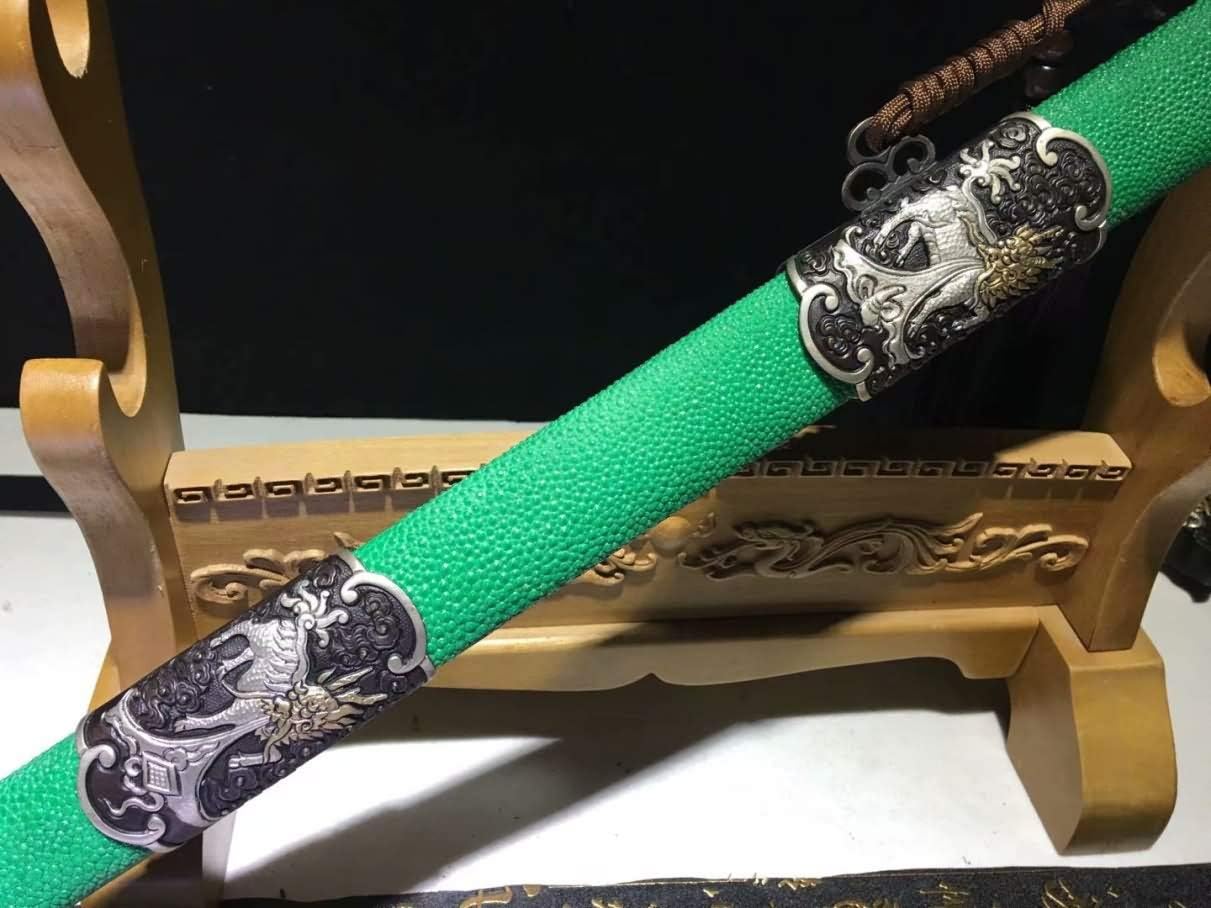 Qing jian,Forged Damascus Burn Blade,Green Skin Scabbard,Brass Fittings