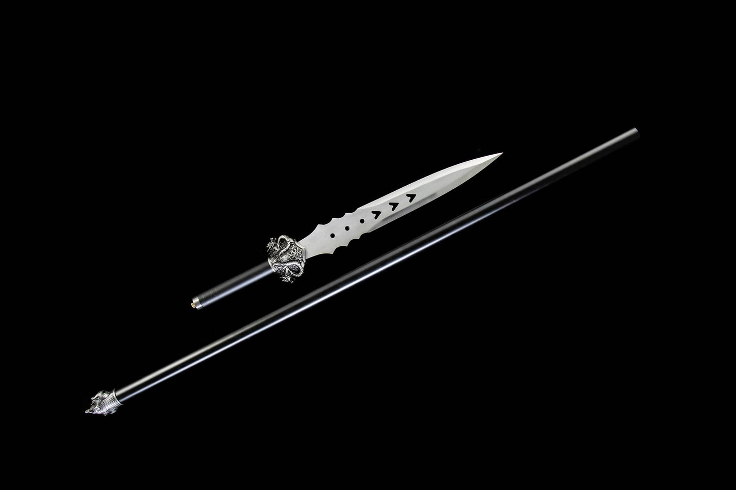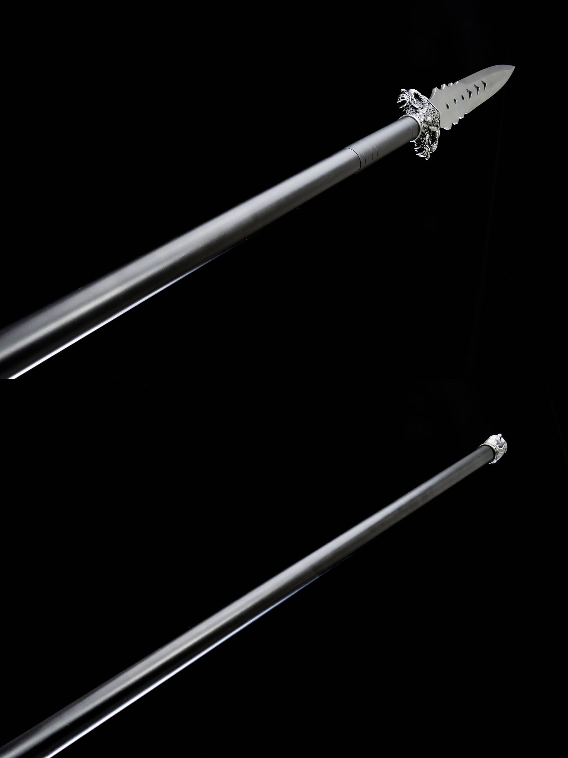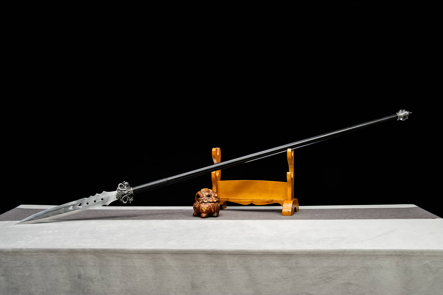 Elevate your wushu practice or collection with this striking 68.9" (175 cm) spear. The 16.1" (41 cm) blade, forged from high-performance manganese steel, delivers outstanding durability and sharpness. A six-section black lacquered iron shaft—three 6.3" (16 cm) and three 43.3" (110 cm) segments—allows for effortless transport and fast assembly. Each segment locks firmly with custom aluminum alloy fittings, ensuring rock-solid stability during advanced routines. Weighing just 5.0 lb (2.25 kg), this spear offers flawless balance for dynamic forms or showcase displays. Please allow for slight variances in dimensions—refer to the actual product for final measurements.