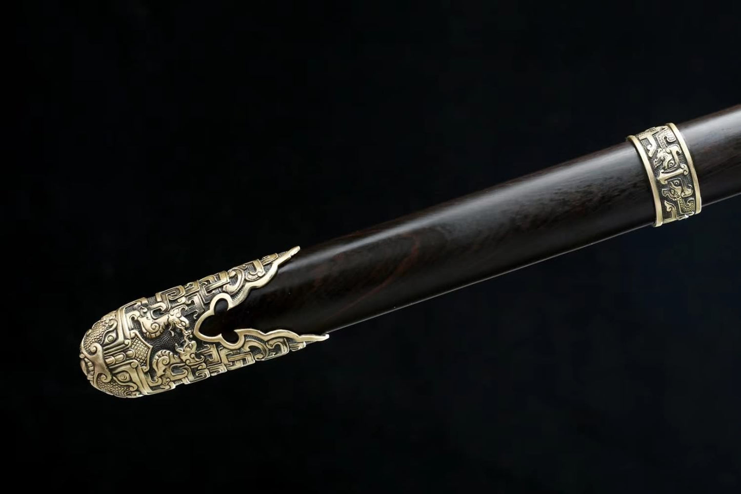 Tang Dao Sword-Hand-Forged Damascus Steel Blade,Ebony Scabbard,Brass Fittings