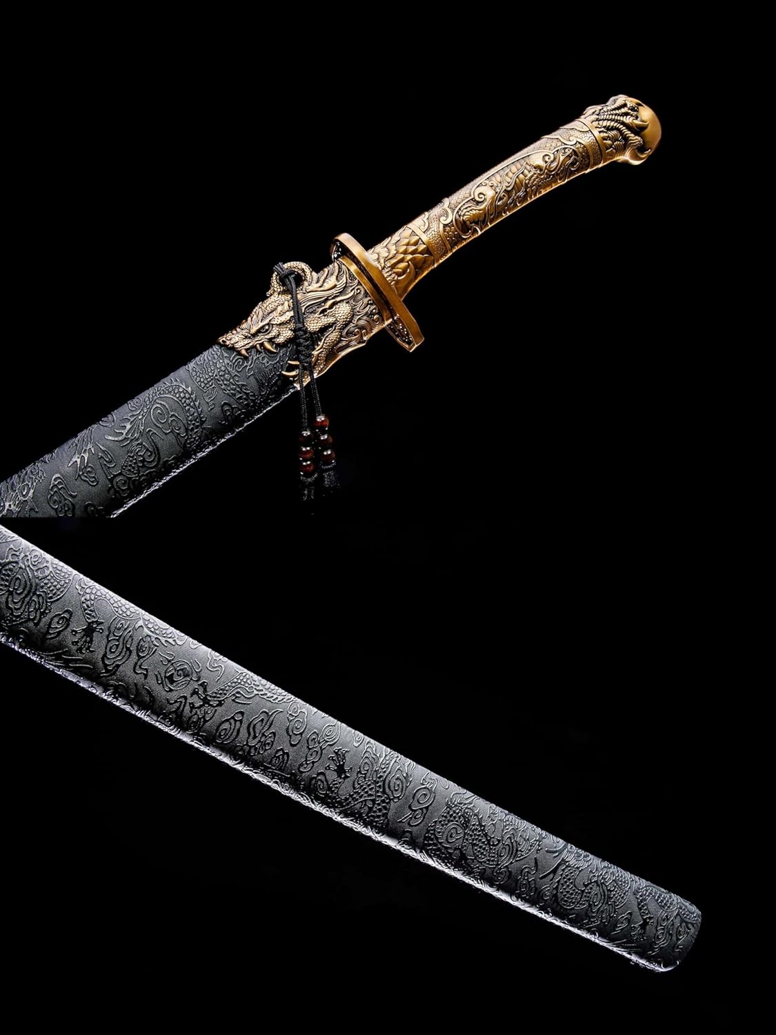 The blade's unique blue finish, achieved through specialized etching, sets it apart, while the scabbard's combination of solid wood and black cloud-patterned PU leather adds to its visual appeal. Aluminum alloy fittings adorned with dragon motifs not only enhance its aesthetic but also pay tribute to Chinese cultural symbolism.