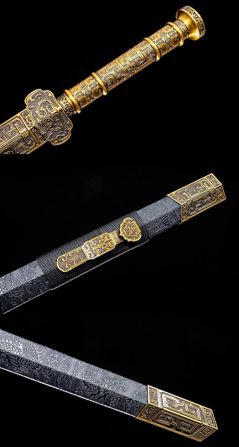 The scabbard is constructed from solid wood wrapped in faux leather, providing durability and an elegant appearance. Intricately designed aluminum alloy fittings featuring the traditional Ruyi motif add to the sword's aesthetic appeal, reflecting exquisite craftsmanship.