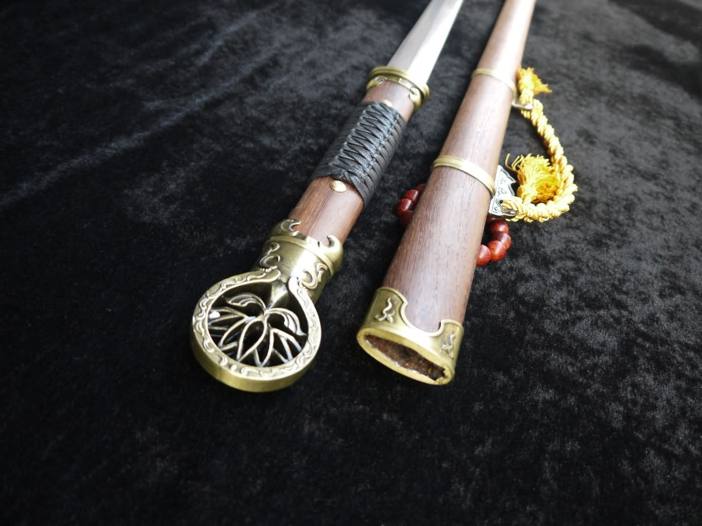 Sword generally consists of three components:blade,sheath and accessories.The main body, blade,is mostly iron,steel,copper.Sheath is made by wood. In order to avoid getting rusted,it should not be stored in damp place nor contact with sour, salty substances. Hand touch should also be avoided in case the surface got corroded by sweat.Oil shoul be applied on surface for maintainance for medium carbon steel,high carbon steel,pattern-welded steel(Damascus steel)material stainless steel blade.