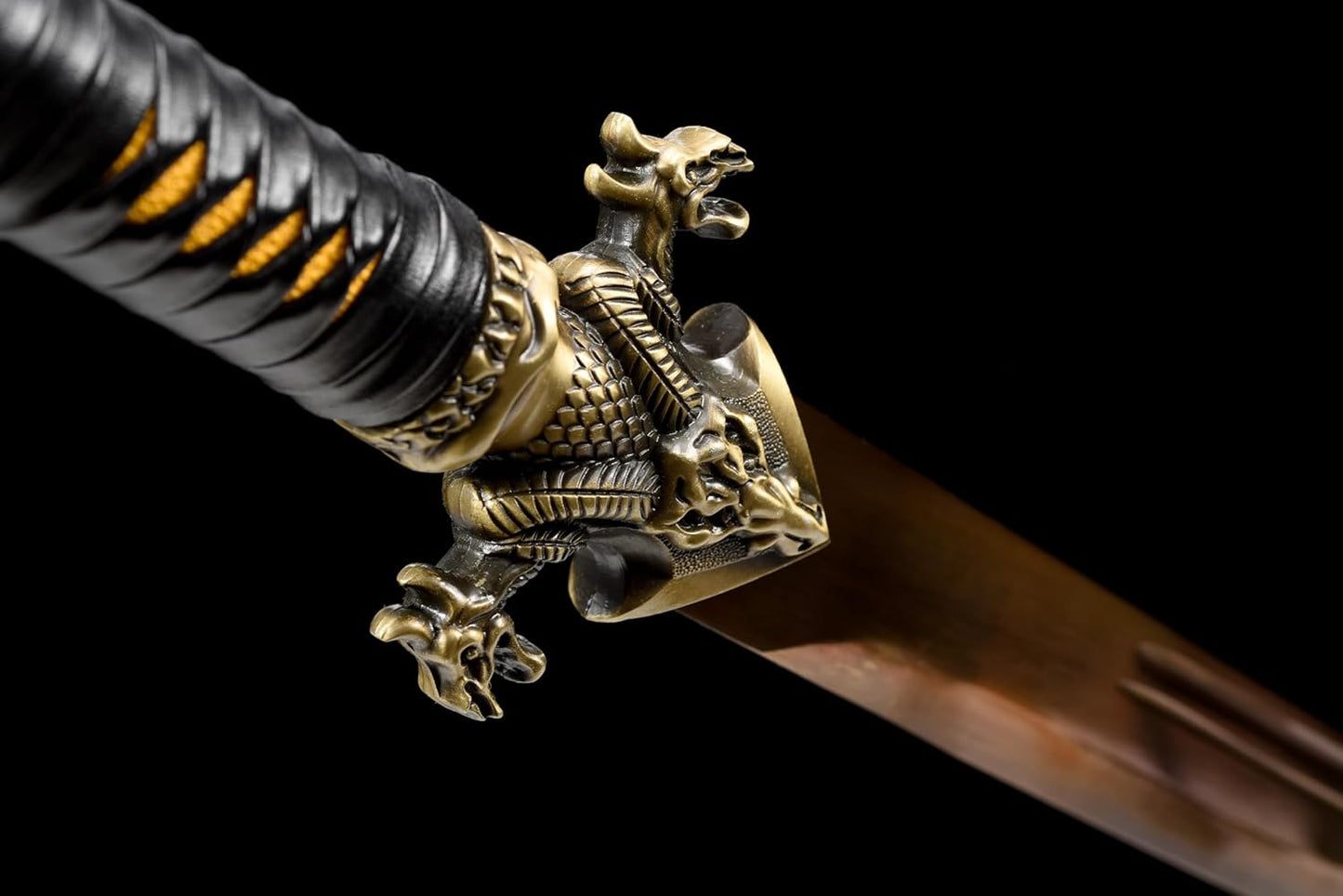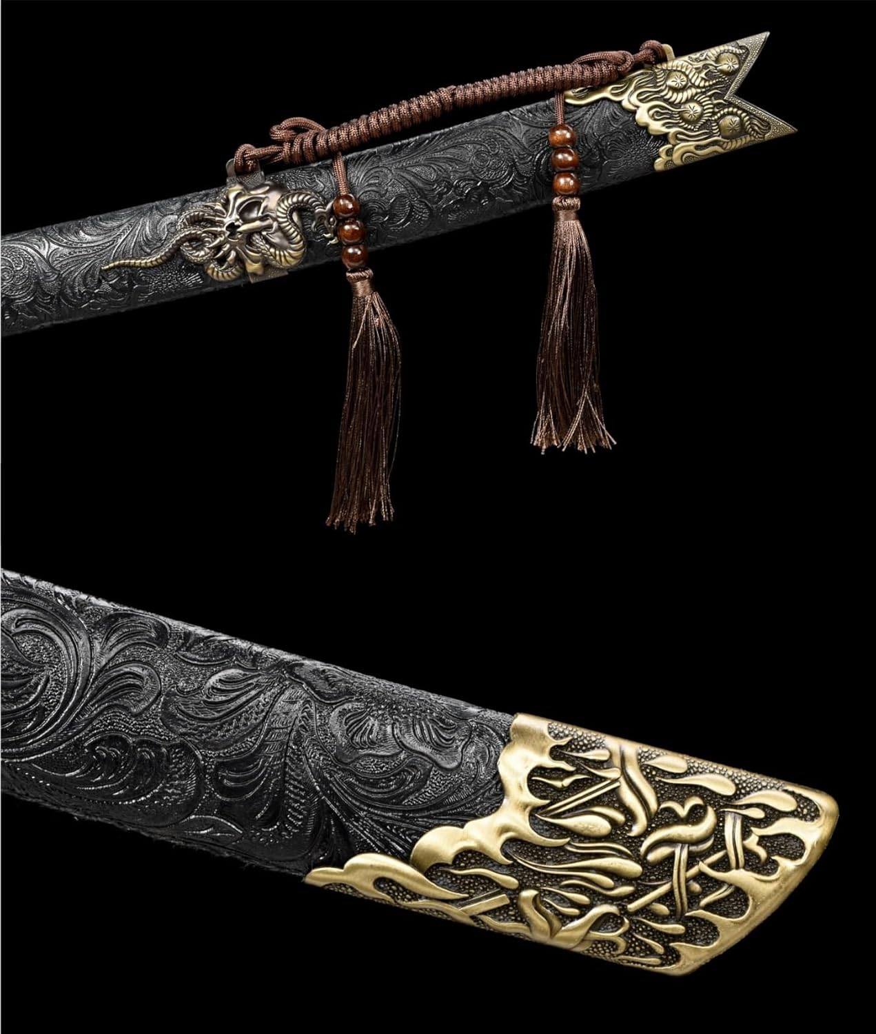 The Flying Dragon Dao is adorned with intricate alloy fittings featuring dragon totems, symbolizing strength and prosperity in Chinese culture. The black wood scabbard, wrapped in faux leather, adds an extra layer of sophistication while ensuring durability. The ergonomic wooden handle, wrapped in black anti-slip cord, provides exceptional grip and balance, making it ideal for martial arts practice, historical reenactments, or decorative display.